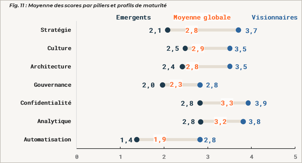 Dans le cadre de notre étude sur la maturité data des organisations RH, chaque répondant au questionnaire a obtenu un score sur sept dimensions :